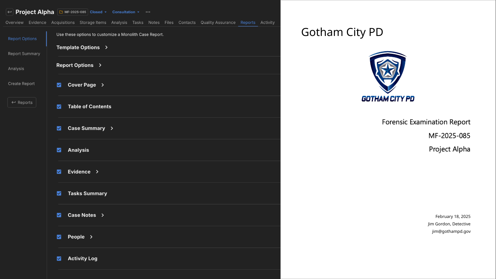 Manage cases, evidence, documentation, tasks, files, and reports in a fast, secure platform built specifically for forensic workflows.