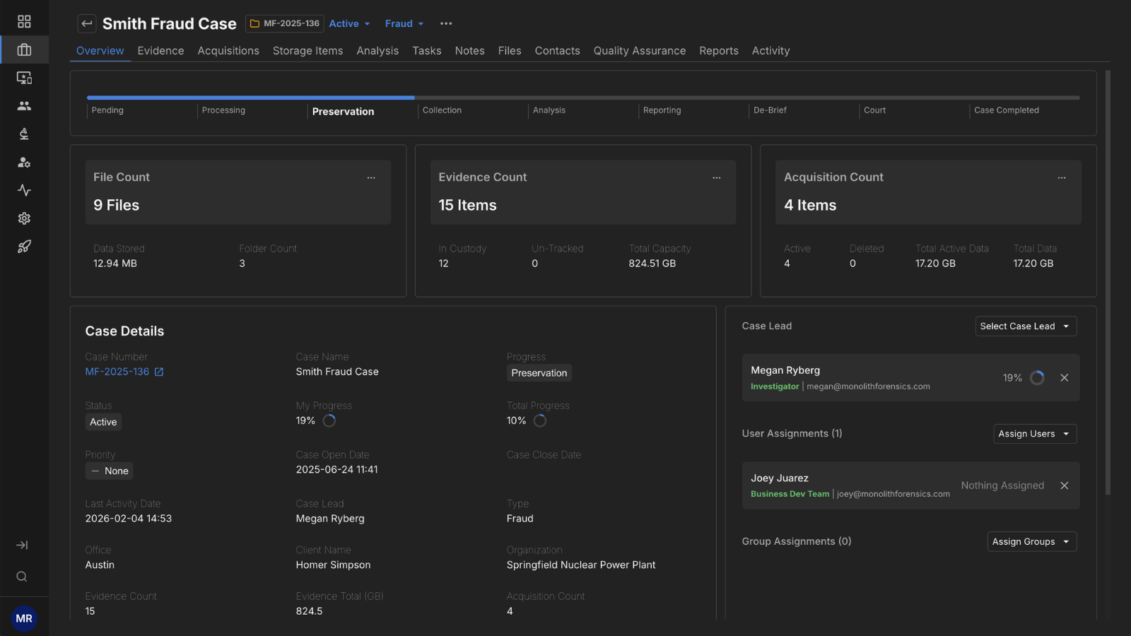 Track cases, evidence, tasks, data collection, files, documentation, and reports in one place.