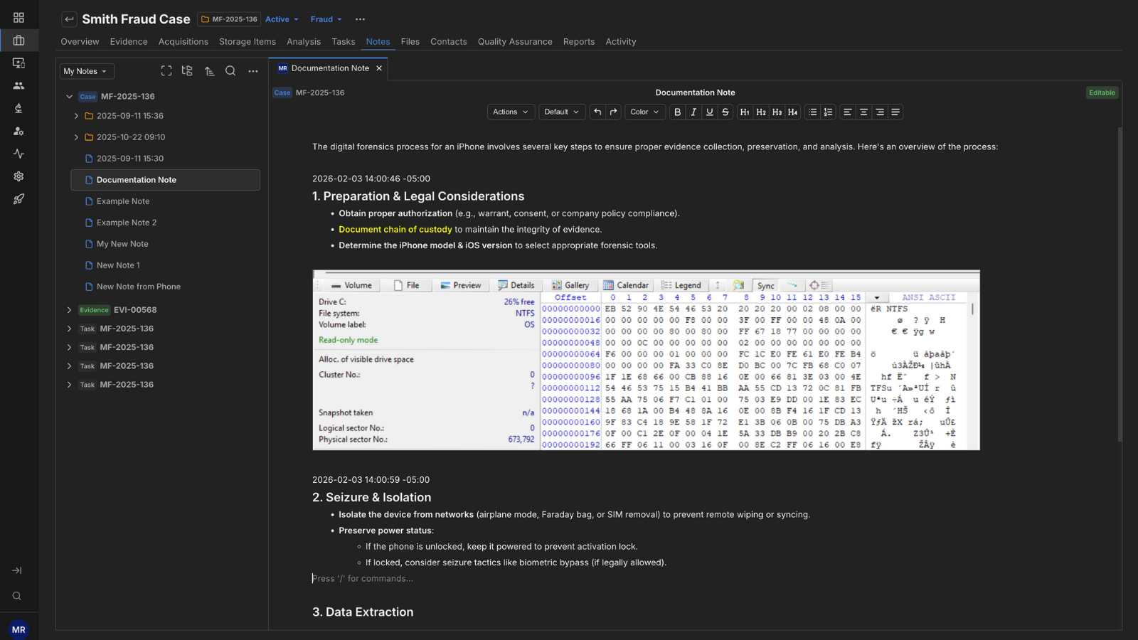 Instantly generate professional reports with your case details, evidence items, data collection logs, and even your case notes, complete with formatting and images.