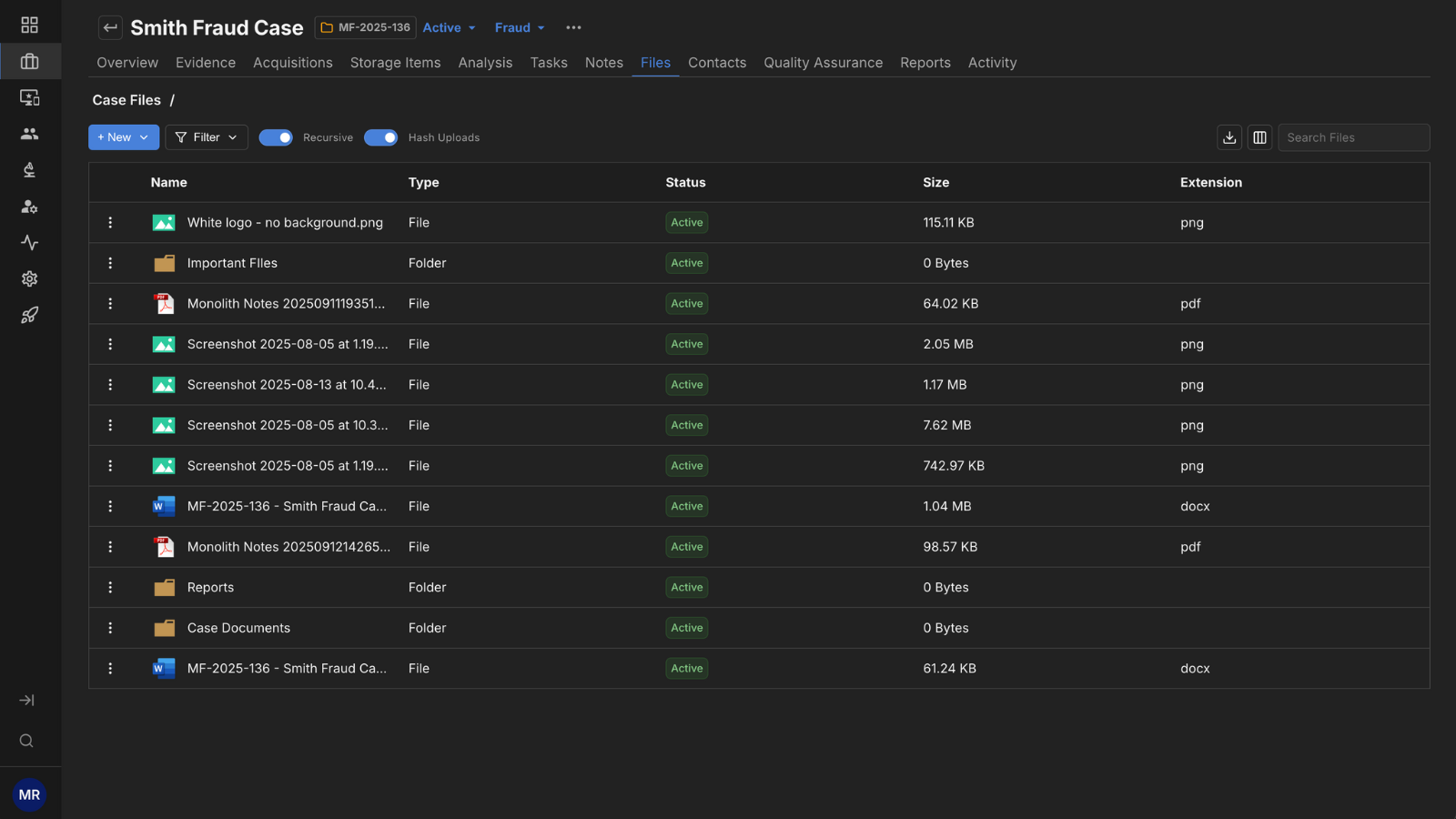 Store files related to your case in secure, cloud-based file storage within the Monolith Forensics platform. Leverages robust object storage within AWS GovCloud to ensure high security and compliance for sensitive forensic data.