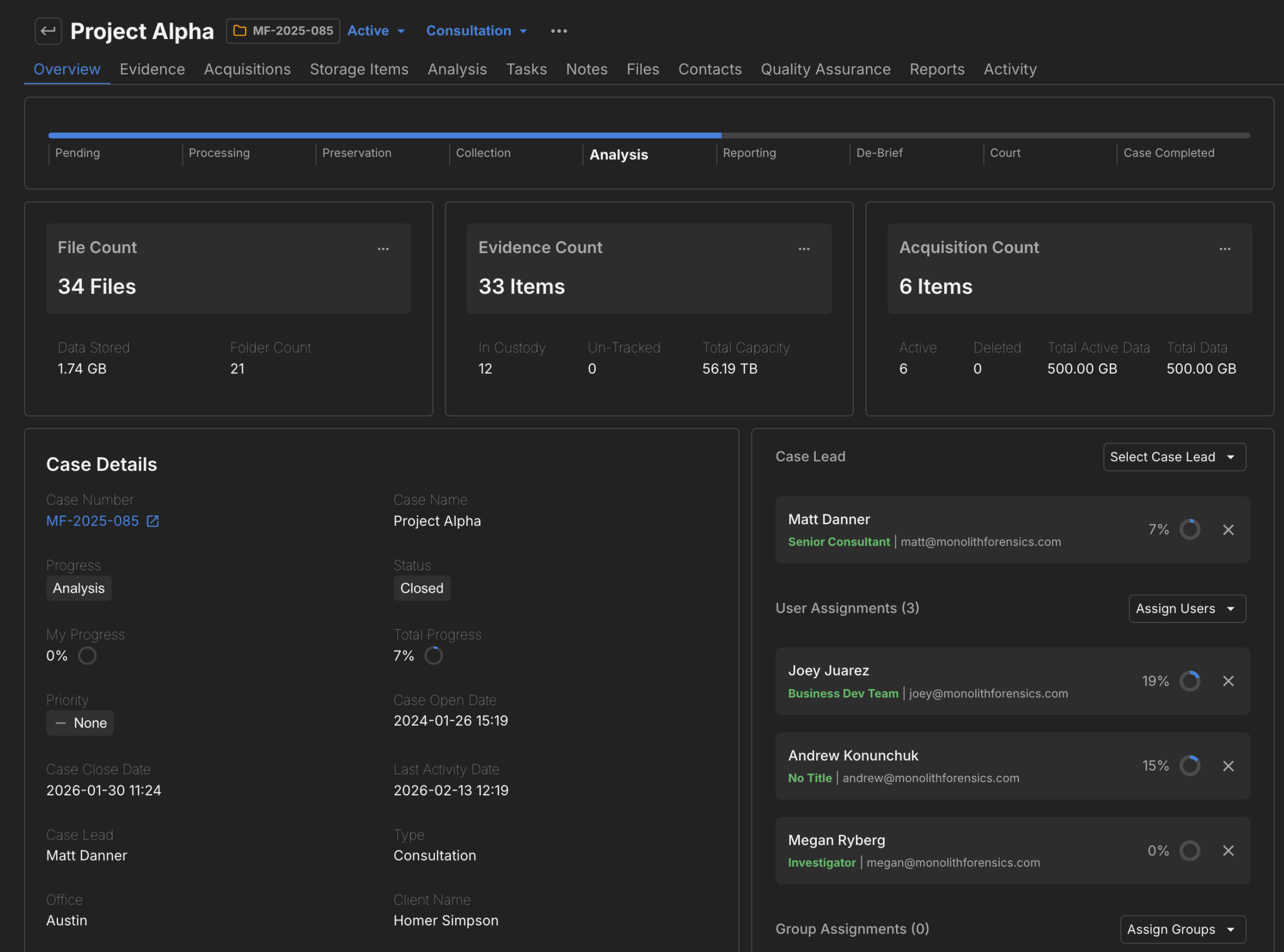 One source of truth for all your forensics work. Monolith brings all your cases, evidence, files, documentation, tasks, and reporting into one secure, searchable platform.