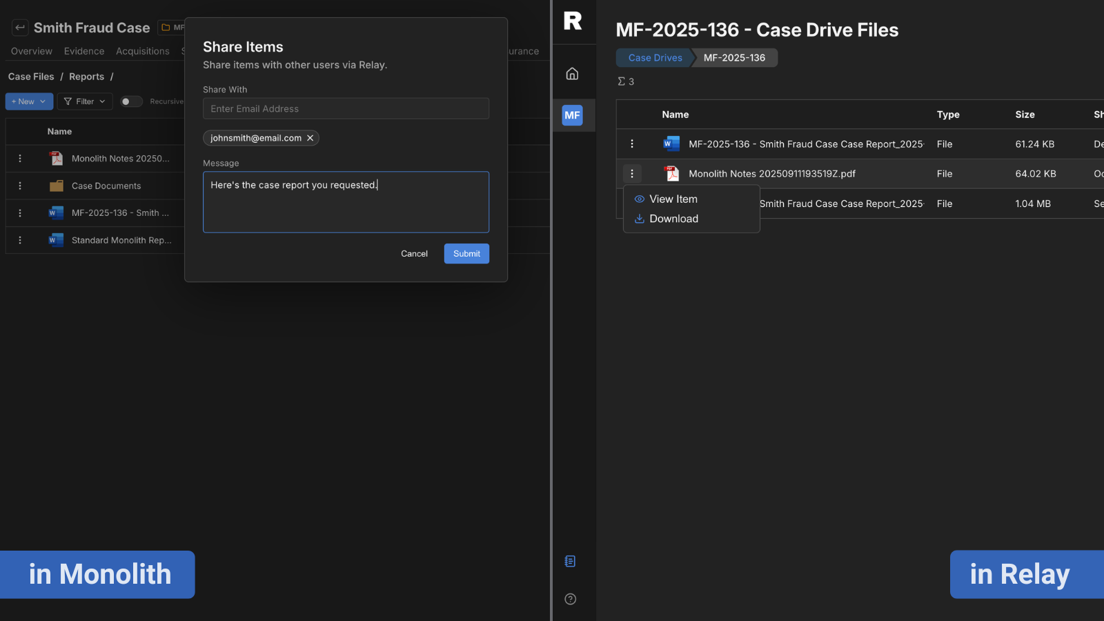 Share files securely with attorneys, outside forensics experts, and anyone else who needs access via a digital case drive in Relay, our web-based forensic request portal. This allows users granted access to view and download the files securely from a browser.